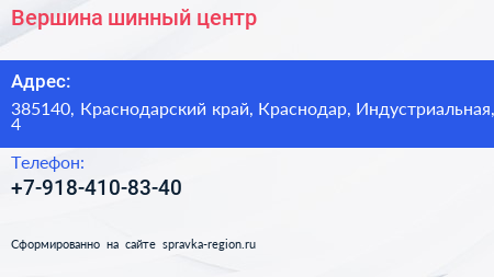Вершина, шинный центр по адресу 385140, Краснодарский край, Краснодар, Индустриальная, 4 в дальнейшем Организация, размещена в следующих категориях: