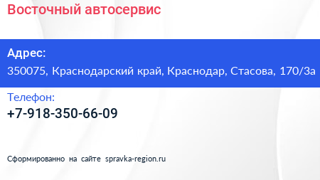 Восточный, автосервис по адресу 350075, Краснодарский край, Краснодар, Стасова, 170/3а в дальнейшем Организация, размещена в следующих категориях: