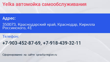 Yelka, автомойка самообслуживания по адресу 350073, Краснодарский край, Краснодар, Кирилла Россинского, 41 в дальнейшем Организация, размещена в следующих категориях: