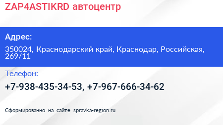 ZAP4ASTIKRD, автоцентр по адресу 350024, Краснодарский край, Краснодар, Российская, 269/11 в дальнейшем Организация, размещена в следующих категориях: