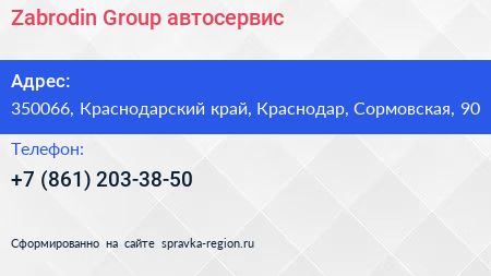 Zabrodin Group, автосервис по адресу 350066, Краснодарский край, Краснодар, Сормовская, 90 в дальнейшем Организация, размещена в следующих категориях: