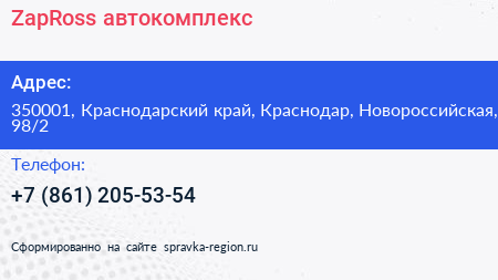 ZapRoss, автокомплекс по адресу 350001, Краснодарский край, Краснодар, Новороссийская, 98/2 в дальнейшем Организация, размещена в следующих категориях: