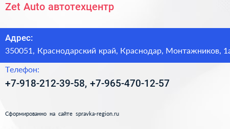 Zet Auto, автотехцентр по адресу 350051, Краснодарский край, Краснодар, Монтажников, 1а в дальнейшем Организация, размещена в следующих категориях: