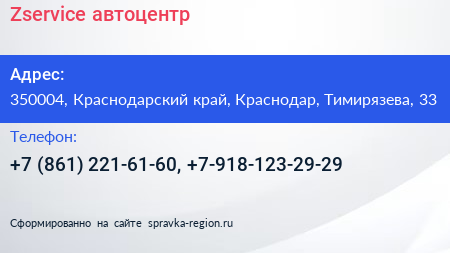Zservice, автоцентр по адресу 350004, Краснодарский край, Краснодар, Тимирязева, 33 в дальнейшем Организация, размещена в следующих категориях: