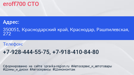 eroff700, СТО по адресу 350051, Краснодарский край, Краснодар, Рашпилевская, 272 в дальнейшем Организация, размещена в следующих категориях: