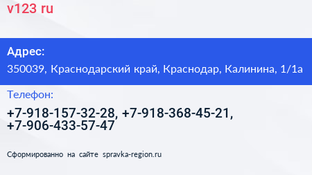 v123.ru по адресу 350039, Краснодарский край, Краснодар, Калинина, 1/1а в дальнейшем Организация, размещена в следующих категориях: