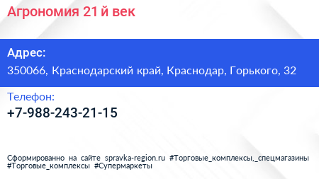 Агрономия 21-й век по адресу 350066, Краснодарский край, Краснодар, Горького, 32 в дальнейшем Организация, размещена в следующих категориях: