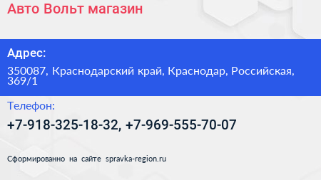Авто-Вольт, магазин по адресу 350087, Краснодарский край, Краснодар, Российская, 369/1 в дальнейшем Организация, размещена в следующих категориях: