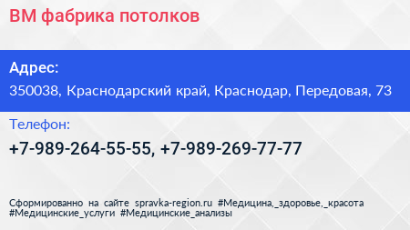BМ, фабрика потолков по адресу 350038, Краснодарский край, Краснодар, Передовая, 73 в дальнейшем Организация, размещена в следующих категориях: