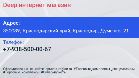 Deep, интернет-магазин по адресу 350089, Краснодарский край, Краснодар, Думенко, 21 в дальнейшем Организация, размещена в следующих категориях: