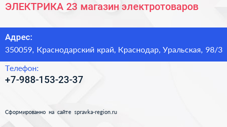 ЭЛЕКТРИКА+23, магазин электротоваров по адресу 350059, Краснодарский край, Краснодар, Уральская, 98/3 в дальнейшем Организация, размещена в следующих категориях: