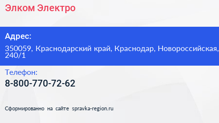 Элком-Электро по адресу 350059, Краснодарский край, Краснодар, Новороссийская, 240/1 в дальнейшем Организация, размещена в следующих категориях: