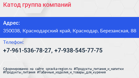 Катод, группа компаний по адресу 350038, Краснодарский край, Краснодар, Березанская, 88 в дальнейшем Организация, размещена в следующих категориях: