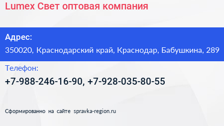 Lumex Свет, оптовая компания по адресу 350020, Краснодарский край, Краснодар, Бабушкина, 289 в дальнейшем Организация, размещена в следующих категориях: