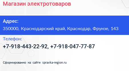 Магазин электротоваров по адресу 350000, Краснодарский край, Краснодар, Фрунзе, 143 в дальнейшем Организация, размещена в следующих категориях: