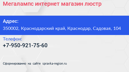 Мегалампс, интернет-магазин люстр по адресу 350002, Краснодарский край, Краснодар, Садовая, 104 в дальнейшем Организация, размещена в следующих категориях: