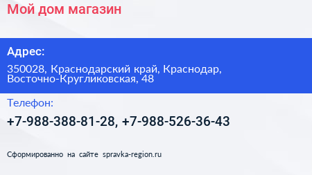 Мой дом, магазин по адресу 350028, Краснодарский край, Краснодар, Восточно-Кругликовская, 48 в дальнейшем Организация, размещена в следующих категориях: