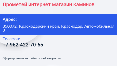 Прометей, интернет-магазин каминов по адресу 350072, Краснодарский край, Краснодар, Автомобильная, 3 в дальнейшем Организация, размещена в следующих категориях: