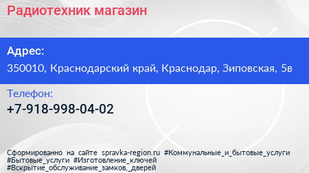 Радиотехник, магазин по адресу 350010, Краснодарский край, Краснодар, Зиповская, 5в в дальнейшем Организация, размещена в следующих категориях: