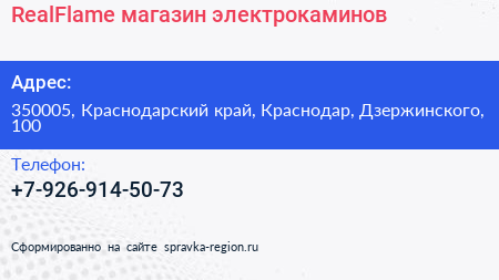 RealFlame, магазин электрокаминов по адресу 350005, Краснодарский край, Краснодар, Дзержинского, 100 в дальнейшем Организация, размещена в следующих категориях:
