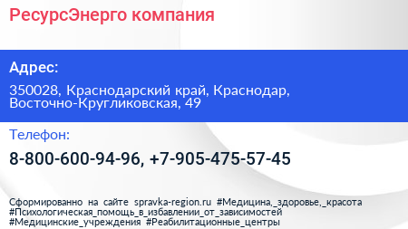РесурсЭнерго, компания по адресу 350028, Краснодарский край, Краснодар, Восточно-Кругликовская, 49 в дальнейшем Организация, размещена в следующих категориях: