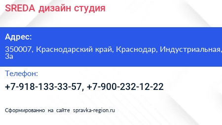 SREDA, дизайн-студия по адресу 350007, Краснодарский край, Краснодар, Индустриальная, 3а в дальнейшем Организация, размещена в следующих категориях: