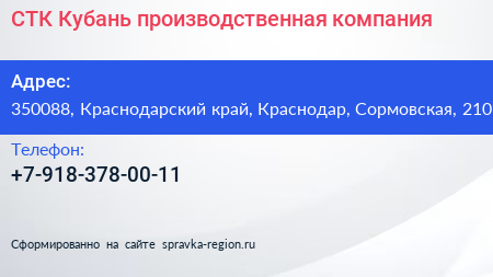 СТК-Кубань, производственная компания по адресу 350088, Краснодарский край, Краснодар, Сормовская, 210 в дальнейшем Организация, размещена в следующих категориях: