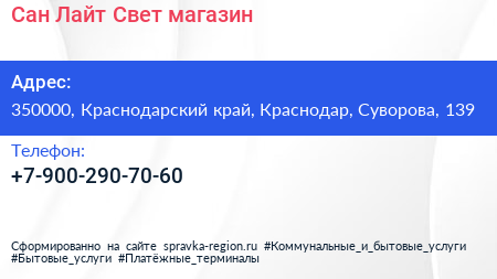 Сан Лайт Свет, магазин по адресу 350000, Краснодарский край, Краснодар, Суворова, 139 в дальнейшем Организация, размещена в следующих категориях: