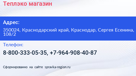 Теплэко, магазин по адресу 350024, Краснодарский край, Краснодар, Сергея Есенина, 108/2 в дальнейшем Организация, размещена в следующих категориях: