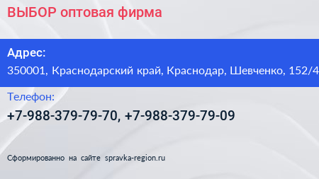 ВЫБОР, оптовая фирма по адресу 350001, Краснодарский край, Краснодар, Шевченко, 152/4 в дальнейшем Организация, размещена в следующих категориях: