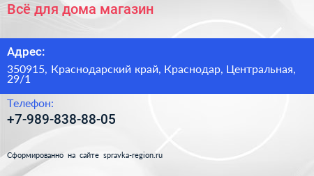 Всё для дома, магазин по адресу 350915, Краснодарский край, Краснодар, Центральная, 29/1 в дальнейшем Организация, размещена в следующих категориях: