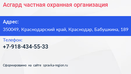 Асгард, частная охранная организация по адресу 350049, Краснодарский край, Краснодар, Бабушкина, 189 в дальнейшем Организация, размещена в следующих категориях: