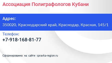 Ассоциация Полиграфологов Кубани по адресу 350020, Краснодарский край, Краснодар, Красная, 145/1 в дальнейшем Организация, размещена в следующих категориях: