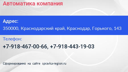 Автоматика, компания по адресу 350000, Краснодарский край, Краснодар, Горького, 143 в дальнейшем Организация, размещена в следующих категориях: