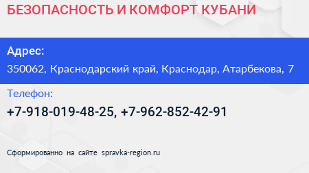 БЕЗОПАСНОСТЬ И КОМФОРТ КУБАНИ по адресу 350062, Краснодарский край, Краснодар, Атарбекова, 7 в дальнейшем Организация, размещена в следующих категориях: