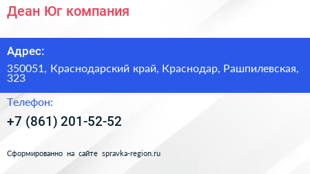 Деан Юг, компания по адресу 350051, Краснодарский край, Краснодар, Рашпилевская, 323 в дальнейшем Организация, размещена в следующих категориях: