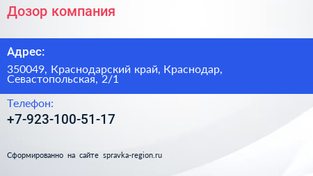 Для связи с организацией воспользуйтесь номером телефона: +7-923-100-51-17. Пн: c 09:00-18:00, Вт: c 09:00-18:00, Ср: c 09:00-18:00, Чт: c 09:00-18:00, Пт: c 09:00-18:00, Сб: выходной, Вс: выходной, вы можете обратиться в эту организацию.