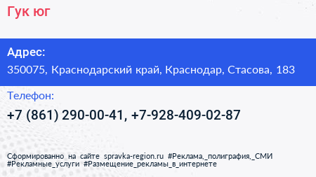Гук-юг по адресу 350075, Краснодарский край, Краснодар, Стасова, 183 в дальнейшем Организация, размещена в следующих категориях: