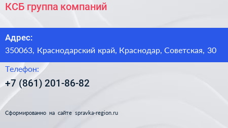 КСБ, группа компаний по адресу 350063, Краснодарский край, Краснодар, Советская, 30 в дальнейшем Организация, размещена в следующих категориях: