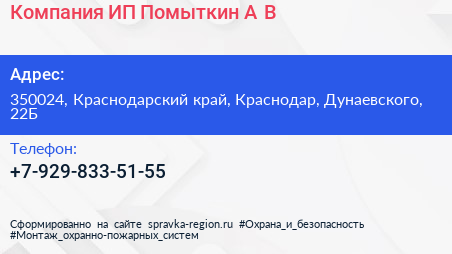 Компания, ИП Помыткин А.В. по адресу 350024, Краснодарский край, Краснодар, Дунаевского, 22Б в дальнейшем Организация, размещена в следующих категориях: