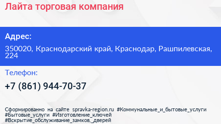 Лайта, торговая компания по адресу 350020, Краснодарский край, Краснодар, Рашпилевская, 224 в дальнейшем Организация, размещена в следующих категориях: