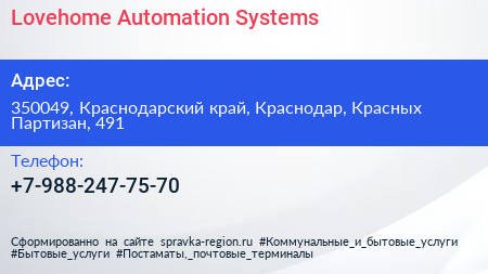 Lovehome Automation Systems по адресу 350049, Краснодарский край, Краснодар, Красных Партизан, 491 в дальнейшем Организация, размещена в следующих категориях: