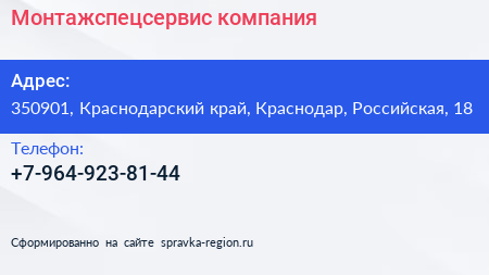 Монтажспецсервис, компания по адресу 350901, Краснодарский край, Краснодар, Российская, 18 в дальнейшем Организация, размещена в следующих категориях: