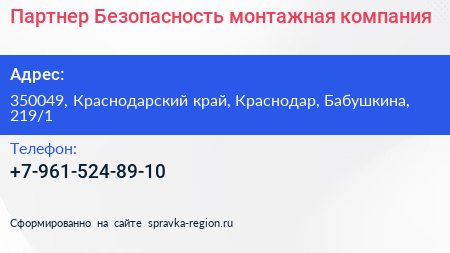 Партнер Безопасность, монтажная компания по адресу 350049, Краснодарский край, Краснодар, Бабушкина, 219/1 в дальнейшем Организация, размещена в следующих категориях: