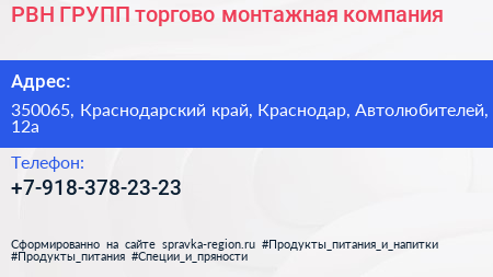 РВН-ГРУПП, торгово-монтажная компания по адресу 350065, Краснодарский край, Краснодар, Автолюбителей, 12а в дальнейшем Организация, размещена в следующих категориях: