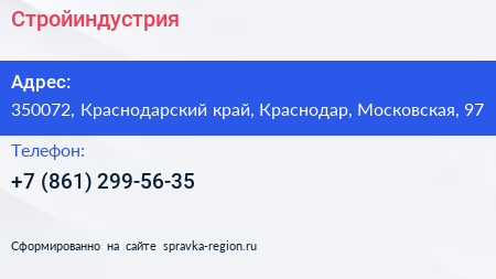 Стройиндустрия по адресу 350072, Краснодарский край, Краснодар, Московская, 97 в дальнейшем Организация, размещена в следующих категориях: