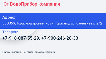 Юг-ВодоПрибор, компания по адресу 350059, Краснодарский край, Краснодар, Селезнёва, 2/2 в дальнейшем Организация, размещена в следующих категориях: