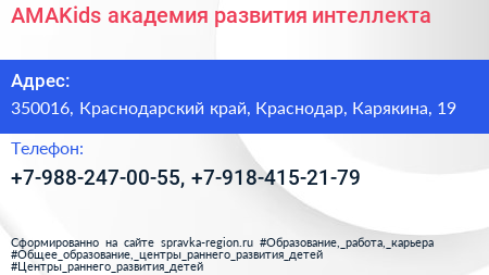 AMAKids, академия развития интеллекта по адресу 350016, Краснодарский край, Краснодар, Карякина, 19 в дальнейшем Организация, размещена в следующих категориях: