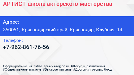АРТИСТ, школа актерского мастерства по адресу 350051, Краснодарский край, Краснодар, Клубная, 14 в дальнейшем Организация, размещена в следующих категориях:
