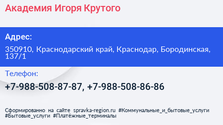 Академия Игоря Крутого по адресу 350910, Краснодарский край, Краснодар, Бородинская, 137/1 в дальнейшем Организация, размещена в следующих категориях: